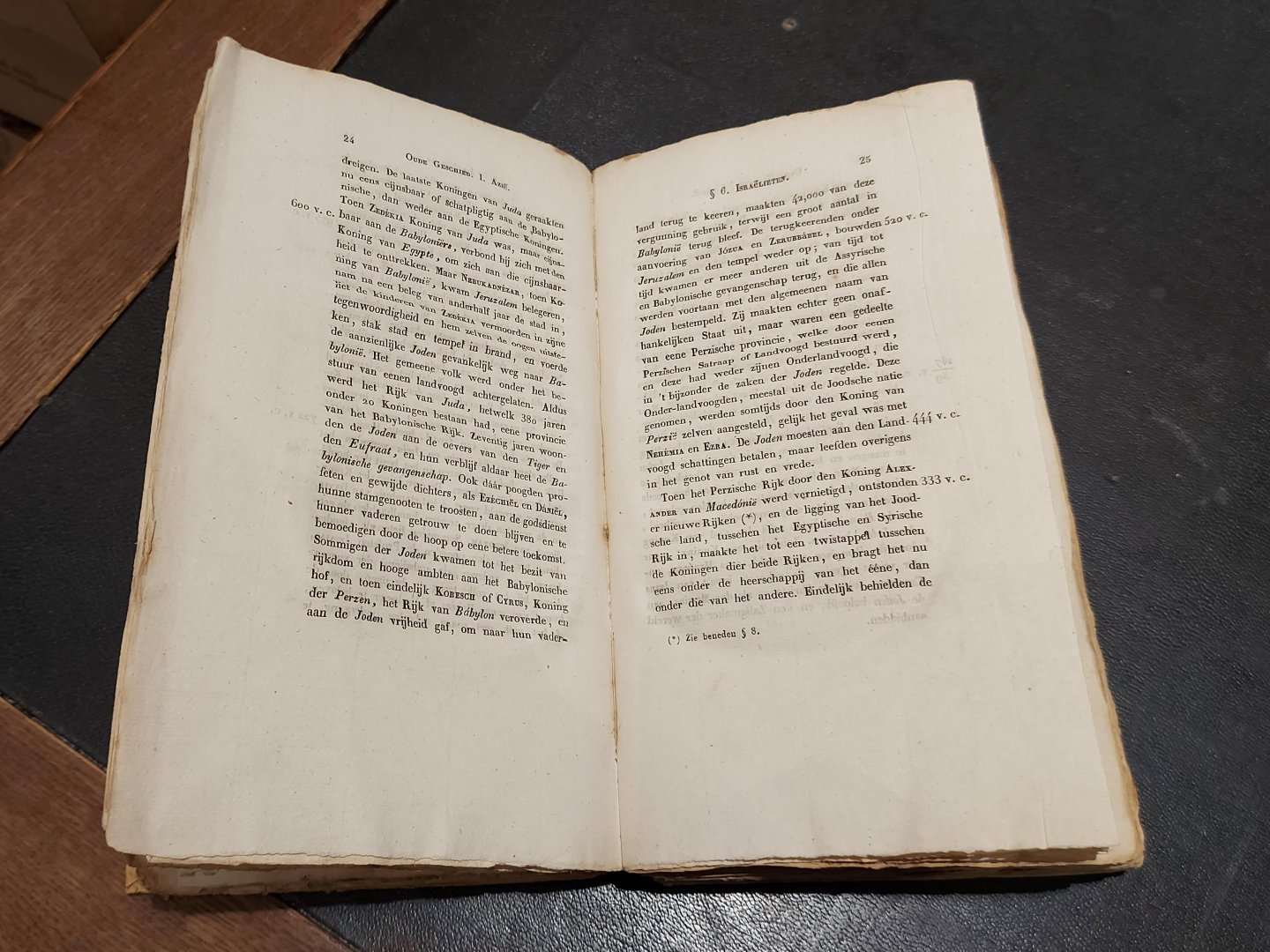 - Extra informatie: Antiquarisch geschiedenisboek voor soldaten, uitgegeven in de jaren '30 van de 19e eeuw, beginnende met de "schepping des Menschdoms (4000 jaren voor Christus)". Met inhoudsopgave. Gebonden in karton met de titel in contemporain handschrift op de cover. Bevat o.a. de Geschiedenis der Israëlieten ("333 v.Chr. [...] de ligging van het Joodsche land, tusschen het Egyptische en Syrische Rijk in, maakte het tot een twistappel tusschen de Koningen dier beide Rijken"). Johannes Bosscha (1797-1874) was hoogleraar geschiedenis en letterkunde aan de Koninklijke Militaire Akademie te Breda vanaf 1828.