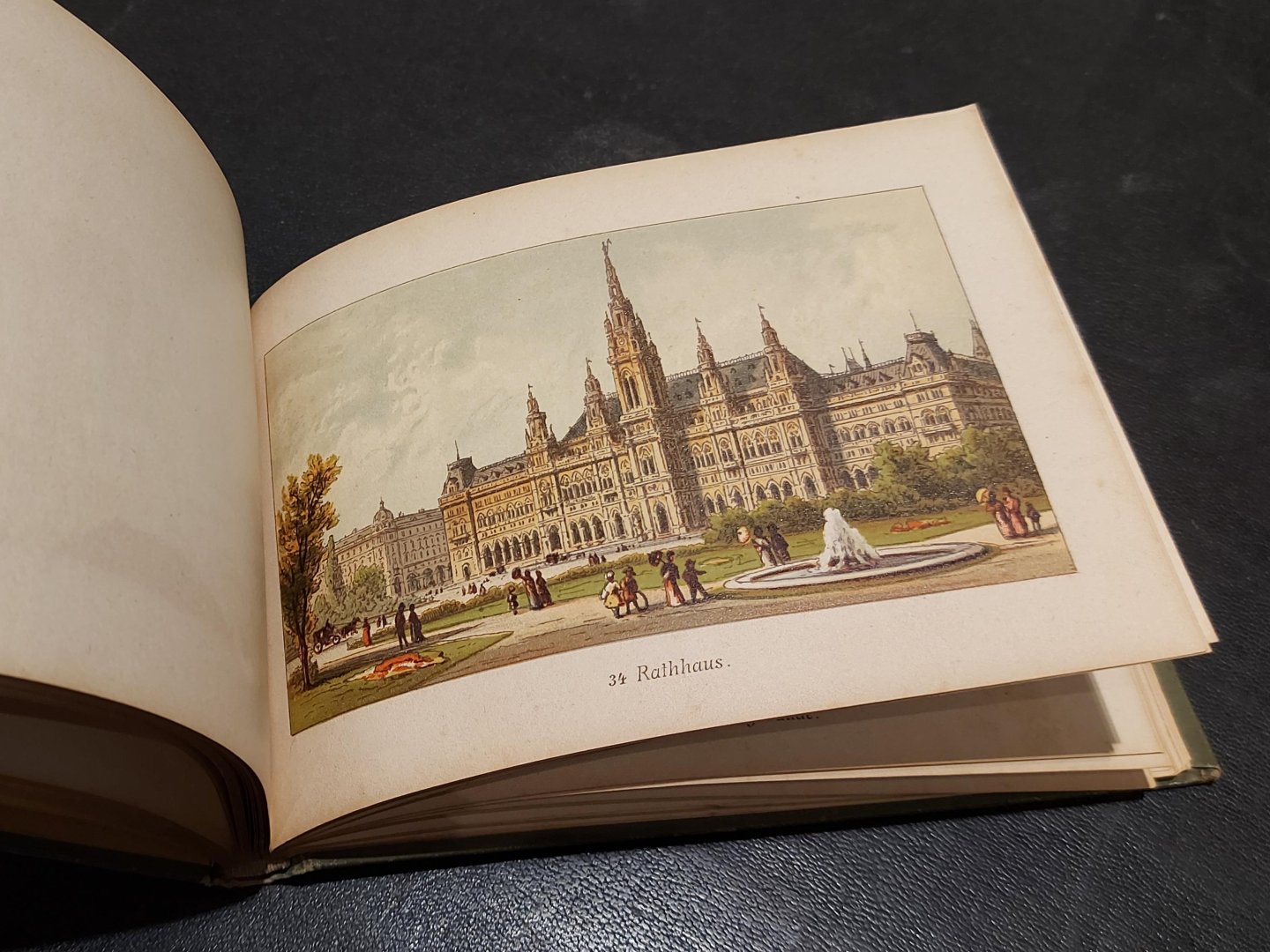 - Extra informatie: Antiquarisch toeristisch souvenirboekje met 50 aanzichten van het 19e eeuwse Wenen en omgeving, "nach Aquarellen von [Giovanni (Johann) Varrone, 1832–1910] und [Ladislaus Eugen Petrovits, 1839-1907] in Farbendruck ausgeführt." ¶ Fraaie chromolitho's van o.a. de Stefanskirche, de Akademie der bildenden Künste met het Schiller Monument, het Theresianum met paardentram, Karlskirche und Polytechnikum, het Schubert Denkmal im Stadtpark en Franz Josephs Quai.